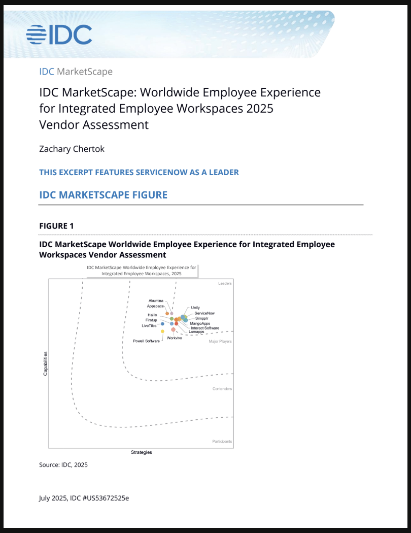 ServiceNow has been recognized as a leader in the 2025 IDC MarketScape: Worldwide Employee Experience for Integrated Employee Workspaces.